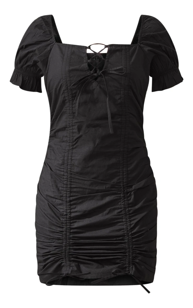 Say hello to your new season staple with this black lace up ruched puff sleeve bodycon dress. Brought to you in a black material with a lace-up design, ruched detailing, puff sleeves and a figure-hugging fit, what more could you want? This back bodycon dress is here to banish any of your what to wear dilemmas doll. Style with sandals and gold accessories for a look that have you being the topic of everyone’s conversation.