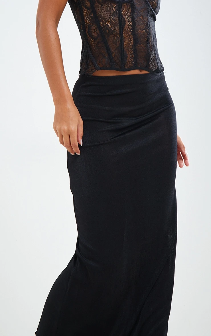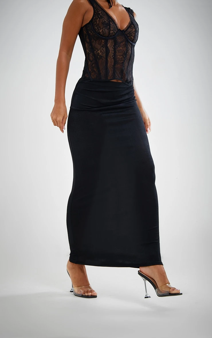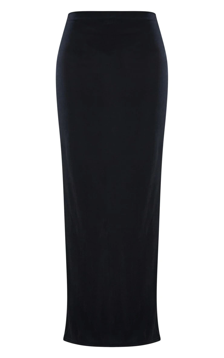 This black slinky acetate basic maxi skirt is sure to be a staple in your weekend wardrobe. Seriously chic and figure-flattering in all the right places, we are obsessed. Made from a black slinky acetate material with a maxi length, how can you resist? Style this maxi skirt with a glam corset top, clear strap heels and statement accessories for a chic look that is sure to steal all the stares.