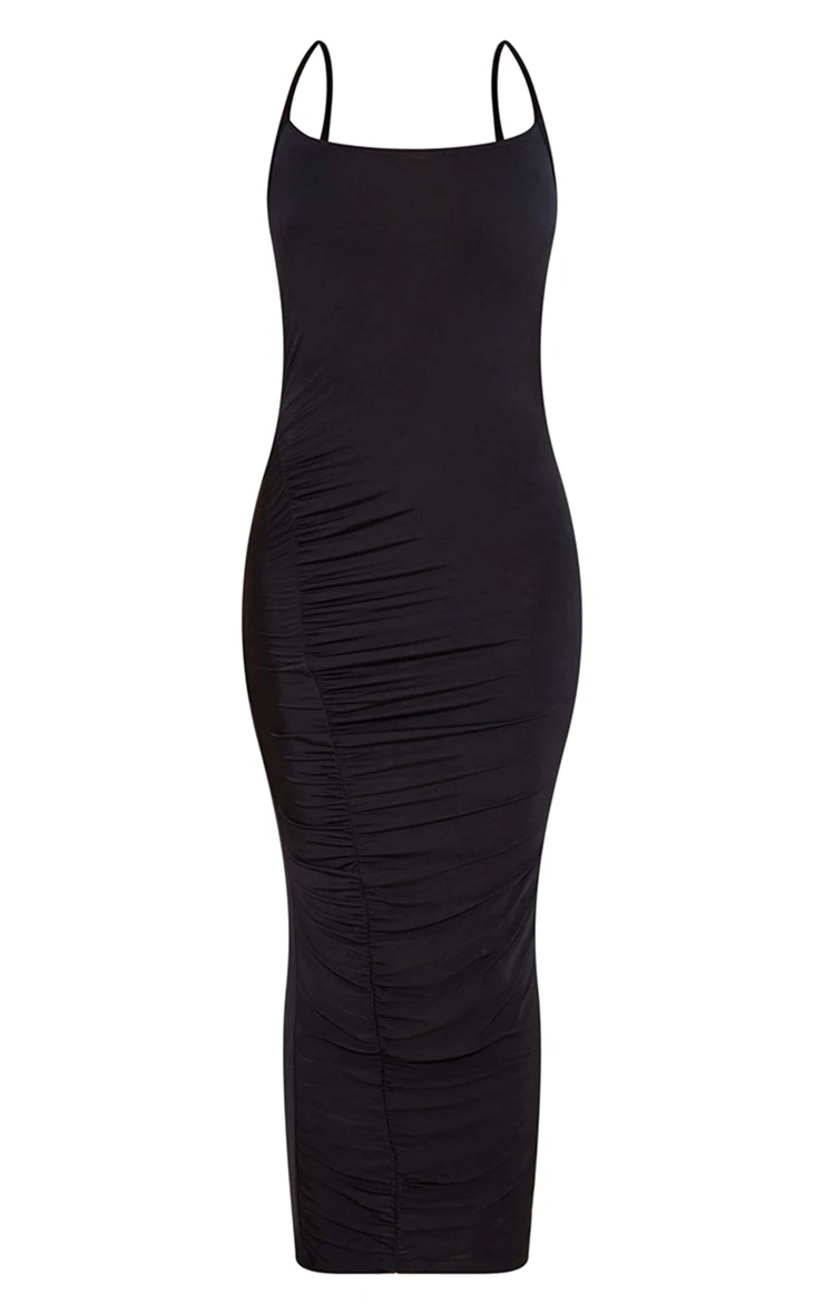 Your weekend fit is finally sorted with this black slinky ruched side halter strap midi dress, it is the perfect piece to take your look from date night to a night with the dolls. This dress includes a black slinky material with a ruched side design and that is sure to show off your shape and a halter style that will bring all the chic vibes, what’s not to love? Pair with clear slip-on heels and a mini bag for a flawless finish.