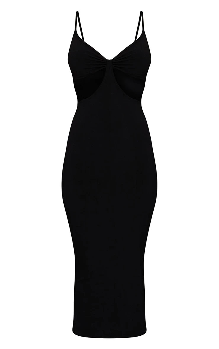 This chic dress is perfect for those special occasions. Featuring a black slinky material with a cut out underbust design, figure-hugging fit and a midi length, we’re obsessed. Style this with strappy heels and gold accessories to complete the look.