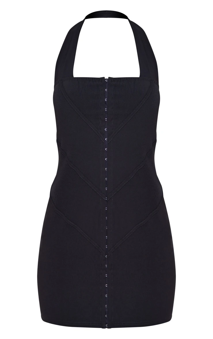 Your weekend outfit is finally sorted with this black stretch woven hook and eye halter bodycon dress. Its black stretch woven material adds all the luxe vibes whilst its hook and eye fastening gives that extra edge to your look. With a halter neckline and a figure-hugging fit, we know you will earn all the compliments this weekend. Style with clear heels and a mini bag for a weekend-worthy finish.