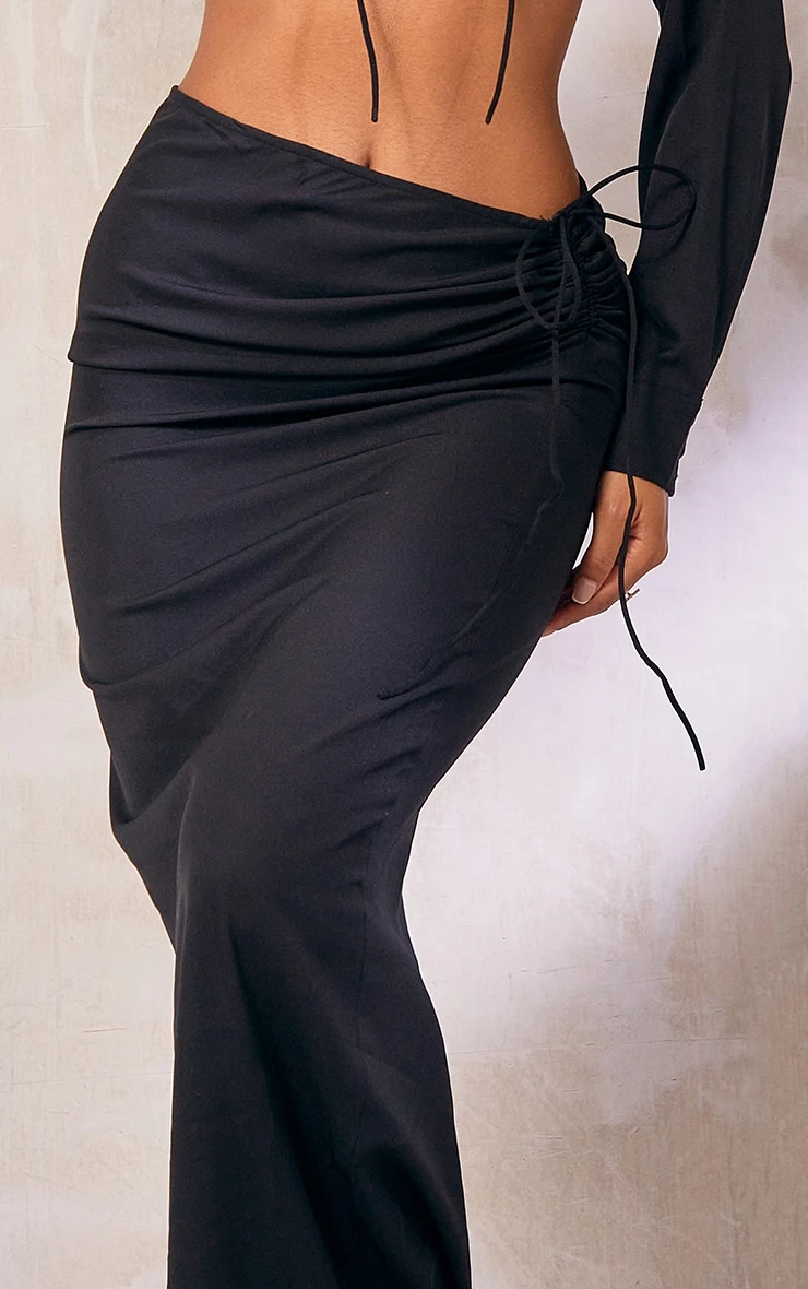 Add chic vibes to your beach look with this maxi skirt. Featuring a black woven fabric with ruched detailing and a tie front design, we love this teamed with the matching top and strappy heels for a luxurious combo.