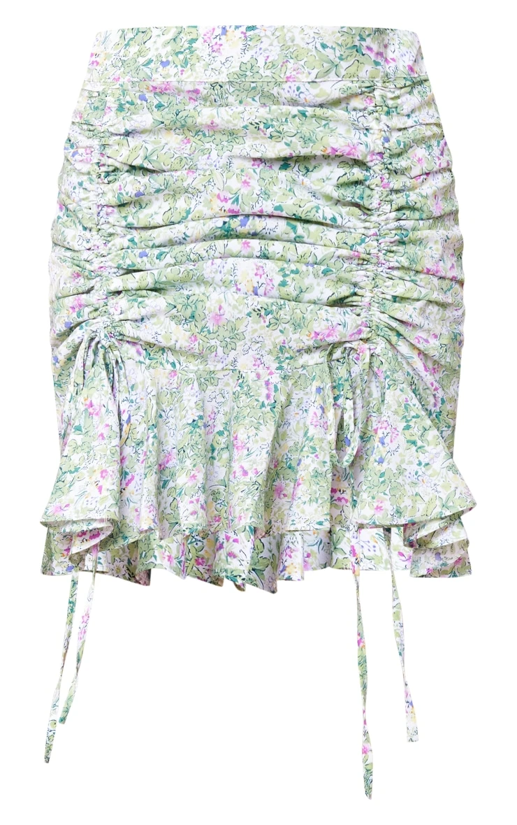 Take any look to new heights with this green floral printed chiffon ruched frill mini skirt. This mini skirt is made from a green chiffon material with a floral print for an effortlessly chic look you wont be able to resist. With a ruched design and a frill detail, this skirt is bringing all the luxe vibes to your wardrobe. Team with some strappy heels and a white tee to complete the look everyone is talking about.
