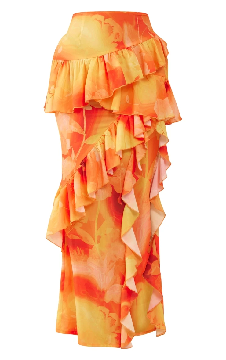 Make them stop and stare in this orange frill detail split thigh maxi skirt. Brought to you in an orange hue material and featuring frill detailing for that extra added drama, we just can’t get enough. With a thigh high split and a maxi length, this skirt is sure to take any look to a whole new level. Style with the matching top, heels and a clutch bag for a look to be remembered doll.