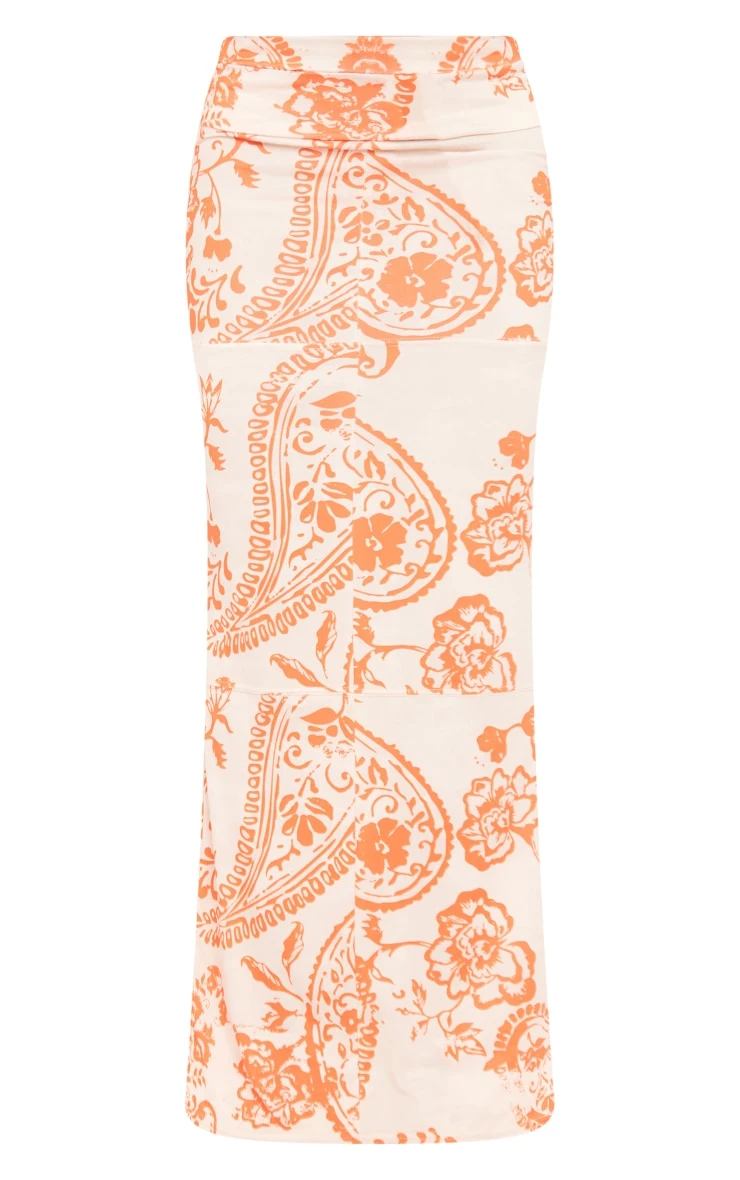 Inject some of this season’s must-have prints into your weekend wardrobe with this orange swirl print soft touch jersey seam detail maxi skirt which won’t let you go unmissed. Brought to you in an orange swirl soft touch jersey material with seam detailing and a maxi length, how could you resist? With its orange swirl print hue you’re sure to have all eyes on you. Pair with an orange crop top, high heels and gold accessories for a glam finish.