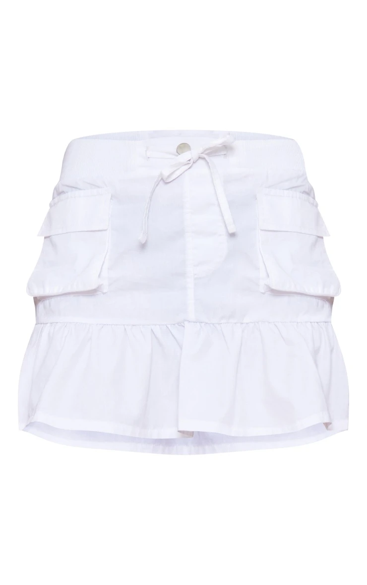 Nail major trends with this white woven frill hem cargo skirt. Brought to you in a white hue woven material with a cargo style that we just can’t get enough of right now and a frill hem design for that extra detailing, what more could you ask for? Team this cargo skirt with a cami top, an oversized denim jacket and strappy heels for a look that is perfect for those weekend plans.